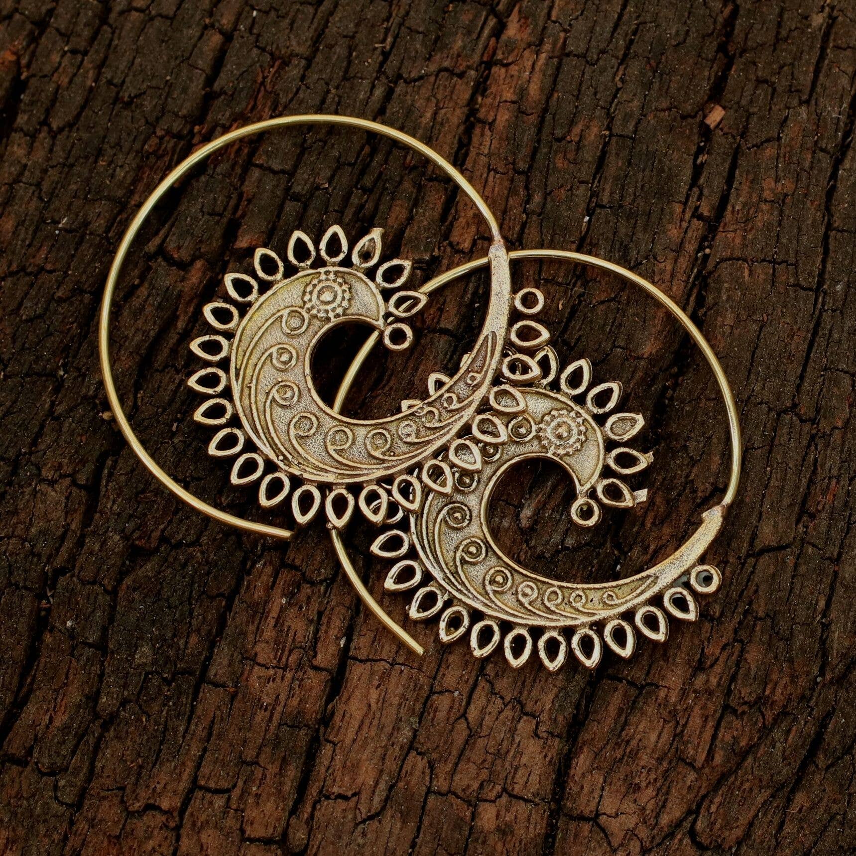 Brass rooster spiral earrings. Our brass collection is a mix of entirely handmade pieces and cast designs, with all details being hand carved. Made by skilled metal smiths in the Rajasthan region of Northern India.